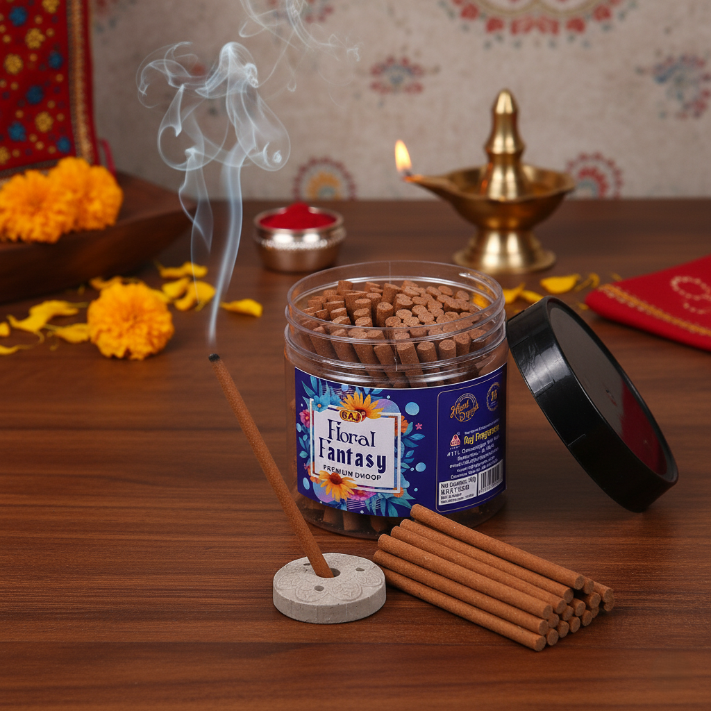 FLORAL FANTASY DHOOP – Floral Fantasy Dhoop is a delicate fusion of blooming florals that uplift the senses. With every burn, it fills the air with a soft, sweet bouquet—ideal for prayer, relaxation, or simply refreshing your space.Let your senses wander through a garden in full bloom. Floral Fantasy Dhoop wraps you in the dreamy fragrance of petals kissed by morning dew—graceful, enchanting, and heartwarming.A gentle floral blend that purifies your space and calms your soul. Floral Fantasy Dhoop is crafted to elevate your daily rituals and create a serene, sacred atmosphere.Floral Fantasy Dhoop offers a luxurious aroma inspired by rare blossoms. Soft yet captivating, its fragrance is perfect for moments of reflection, beauty, and inner peace.