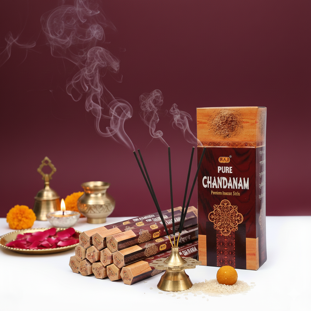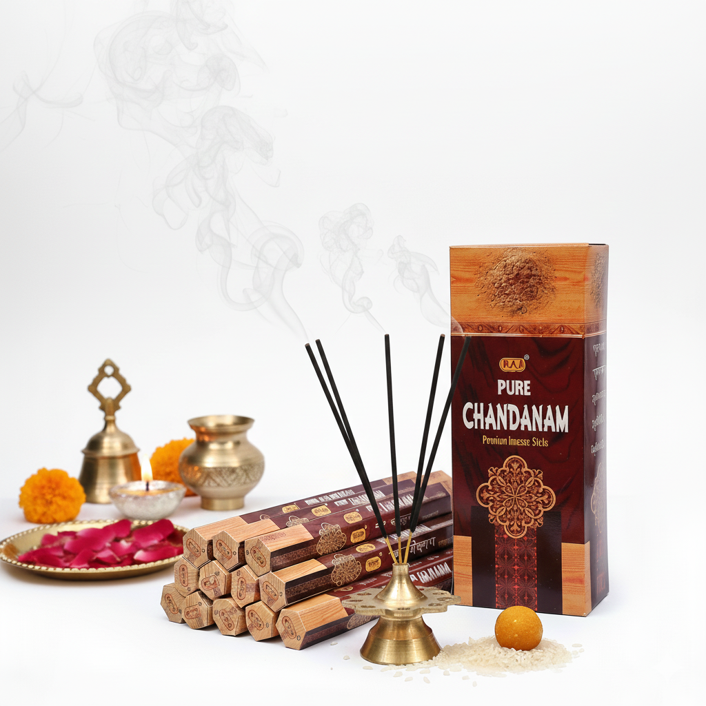 PURE CHANDANAM – Pure Chandanam carries the timeless essence of sacred sandalwood. Its rich, earthy aroma purifies the air, calms the mind, and creates a divine atmosphere for prayer and meditation.Experience the luxury of pure sandalwood with Pure Chandanam. A creamy, warm fragrance that evokes peace, purity, and sophistication—perfect for refined spaces and sacred rituals.