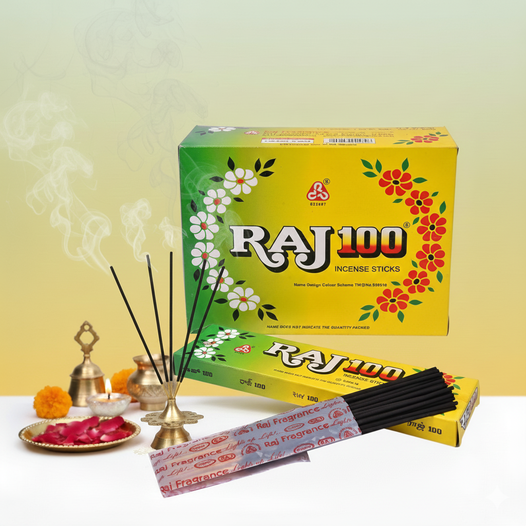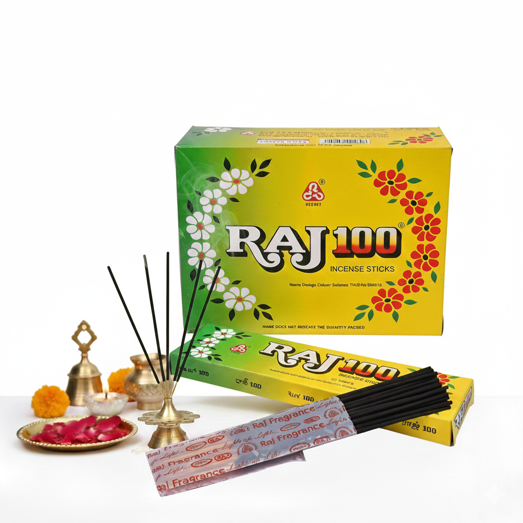 Raj 100 incense sticks are perfect for aromatic and religious settings, supporting both individual and group usage. Their eco-friendly bamboo material and coated fragrance provide an anti-odour property, making them ideal for temples, meditation rooms, and homes. The straight shape, non-stick surface, and consistent 4.5-minute burning time enhance convenience. The smooth, gilt-edged finish ensures an elegant feel, solidifying its role as a premium regional feature in Indian incense traditions.