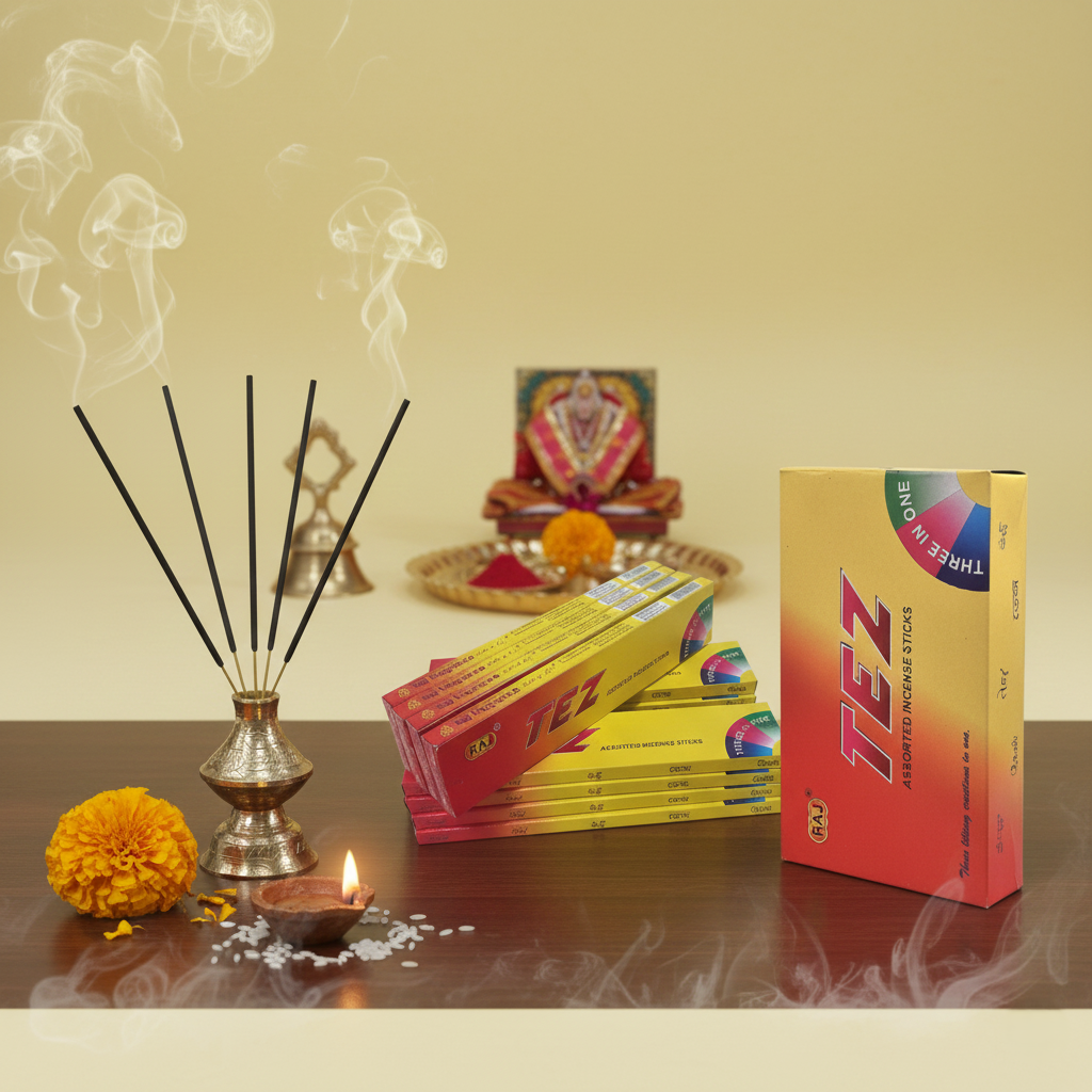 Packing Form: BoxContents per Box: 3 bundles × 3 sticks = 9 incense sticks per boxMaximum Retail Price (M.R.P.): ₹7.00 per boxUnit Packing: 12 boxes = 1 dozenCarton Packing: 108 dozens per carton